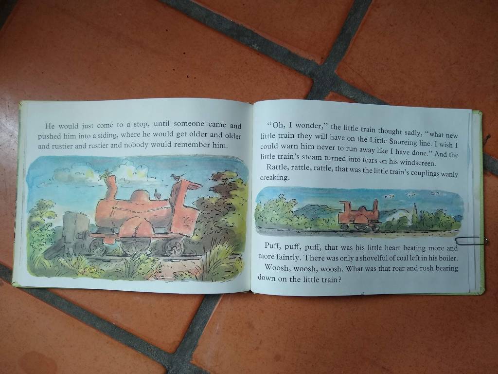 The little train lives in the sleepy village of Little Snoreing and every day runs the line between there to the market town of Much Snoreing. People visit Little Snoreing because of the beautiful and quiet countryside around it. Those that live along the line set their clocks by the train’s passing. But a whole world covered in tracks beckons to the little train. So, early one morning, he leaves his engine house and runs away.