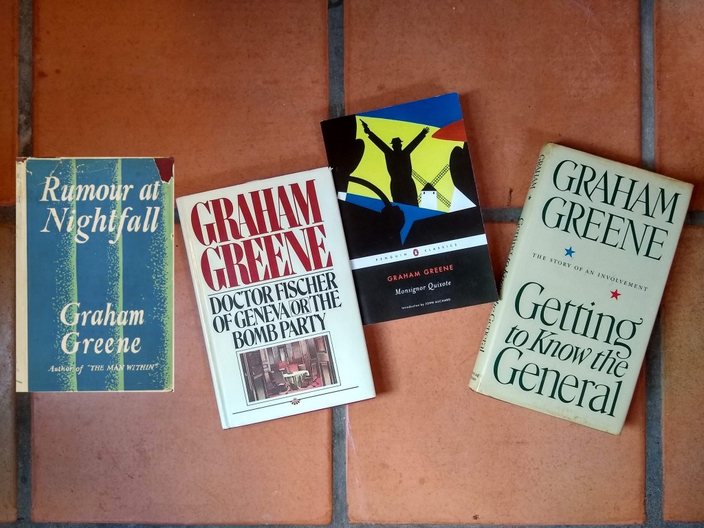 In October I will read the four books of Graham Greene according to my list: Rumour at Nightfall, the second of his two early novels that he later repressed, Doctor Fischer of Geneva or the Bomb Party, Monsignor Quixote, and Getting to Know the General: The Story of an Involvement.